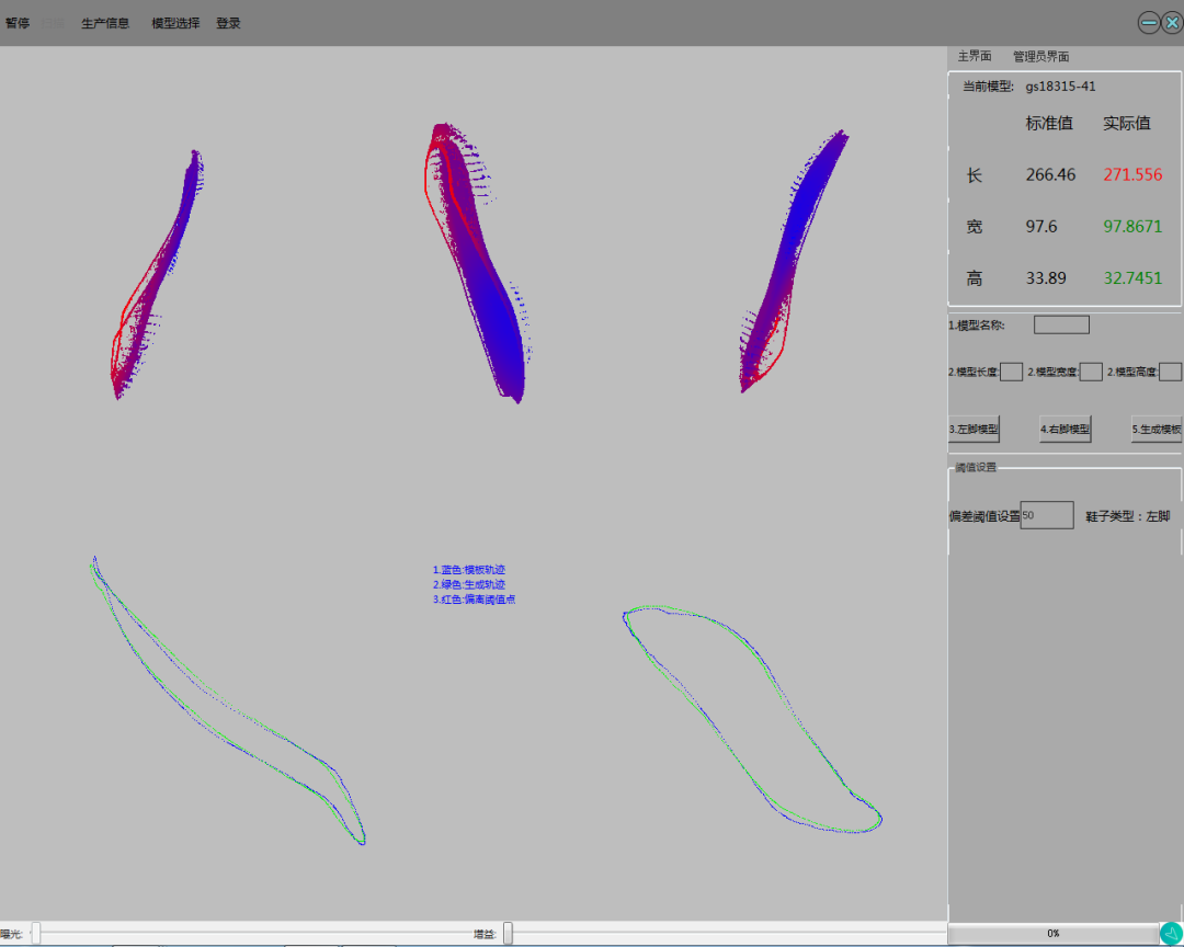 通過以上兩個(gè)環(huán)節(jié)的配合工作,流水線上的鞋坯三維信息被準(zhǔn)確捕獲,上位機(jī)接收到3D輪廓傳感器采集的鞋坯三維點(diǎn)云數(shù)據(jù),并對(duì)數(shù)據(jù)進(jìn)行三維測(cè)量,計(jì)算得出被掃描鞋坯的長度、寬度信息,并通過電磁閥彈推裝置對(duì)長度在不同尺碼范圍內(nèi)的鞋坯進(jìn)行分揀。同時(shí)上位機(jī)界面簡(jiǎn)單直觀方便現(xiàn)場(chǎng)工作人員實(shí)時(shí)查看流水線自動(dòng)檢測(cè)情況,上位機(jī)界面如下圖所示: